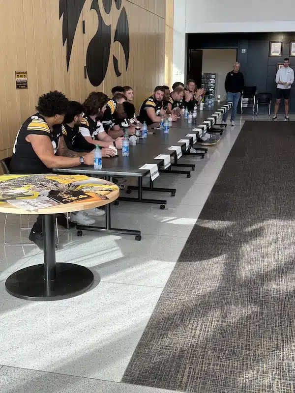 Campers and players received a great breakfast, along with a t-shirt, football, and posters to be signed. A big thank you to Camp Board Member, Glenn Hasken, for reaching out to Molo Companies, Dubuque, for sponsoring the event and providing all the above for the campers and players.