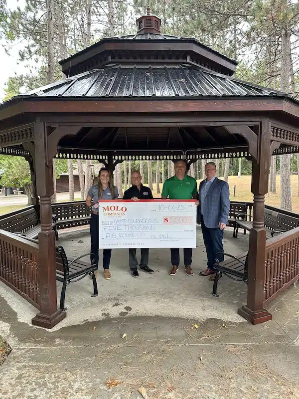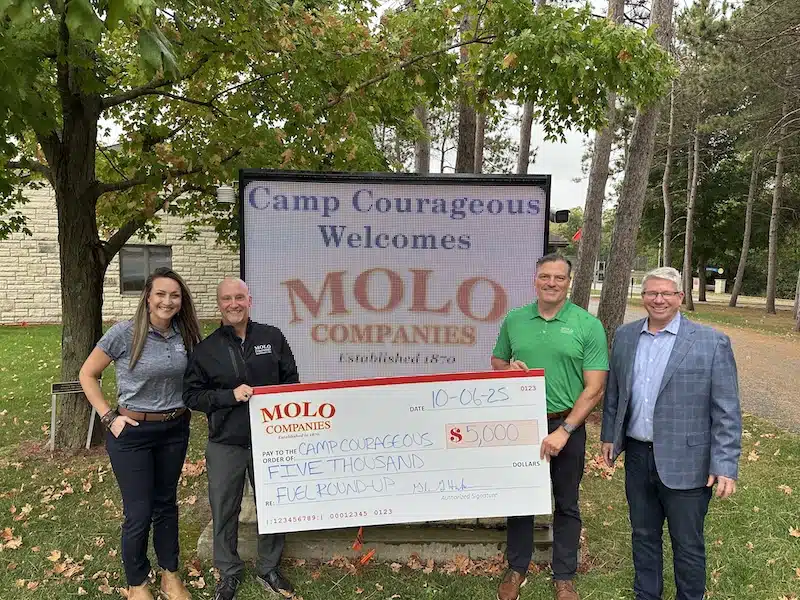 A huge thank you to the Molo Companies for providing Camp Courageous proceeds from their Round-Up for Camp Courageous at their Big 10 Mart Stores. Delivering a check to Camp and enjoying a grand tour of the Camp is Camille Willett, Marketing Manager; Chad Leber, Director of Operations; Dennis Jaeger, Wholesale Division Manager; and Glenn Hasken, COO/VP of Molo. In addition, Glenn is a Camp Courageous Board Member and Past Chair of the Board of FUELIowa. Molo is involved in virtually every Camp event…which Camp is very grateful. Molo started in 1870s as a coal supplier and is currently Molo Petroleum, Molo Plumbing & Heating, and have the Big 10 Mart stores…great folks!