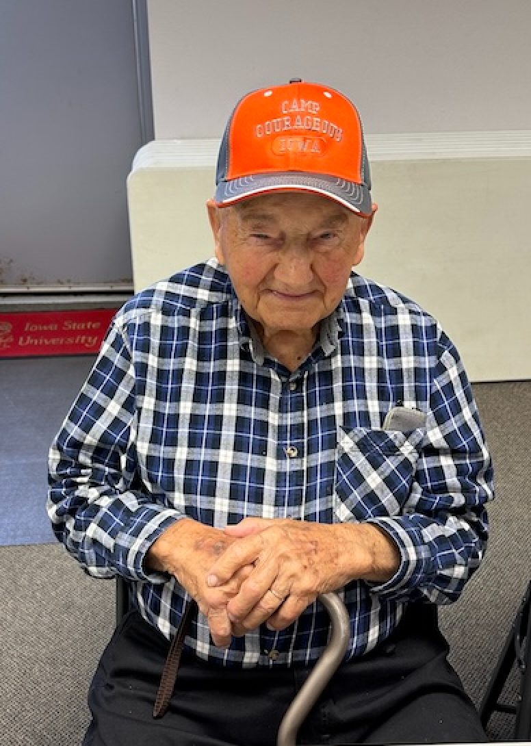 Camp Courageous’ Board Member, Merlin Hulse will turn 102 on September 21, 2025.  Healthy and well, Merlin has been a wonderful advocate for Camp Courageous, as he works, virtually all Camp events!  Merlin’s 3-year term recently was up, and he has decided to retire from the board.  If one would like to send Merlin a card and a note of appreciation for all that he has done for so many, his address is:  Merlin Hulse, 1001 Plum ST, Tipton IA 52772.  Merlin is sporting his new Camp Courageous hat!