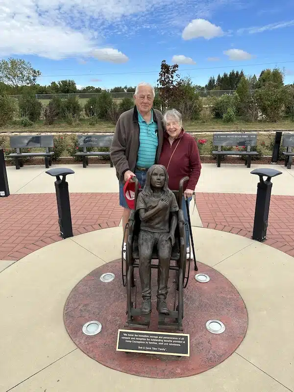 It was an honor to have Bob & Carol Tibor visit Camp Courageous and see first-hand the beautiful Camp Courageous Nature Trail Bob & Carol Tibor’s Family and Bob’s sister Marilyn Worthington helped provide Camp. Bob & Carol Tibor’s Family also provided the funds for the bronze statue that sits at the center of the Mainliner Memorial Park. It is symbolic of each day at Camp Courageous when the campers raise the flag and say their pledge of allegiance. Below the girl in a wheelchair, is a plaque that reads, “We honor the incredible courage and perseverance of all campers and recognize the outstanding benefits provided at Camp Courageous by families, staff, and volunteers. Bob & Carol Tibor Family.”