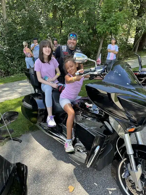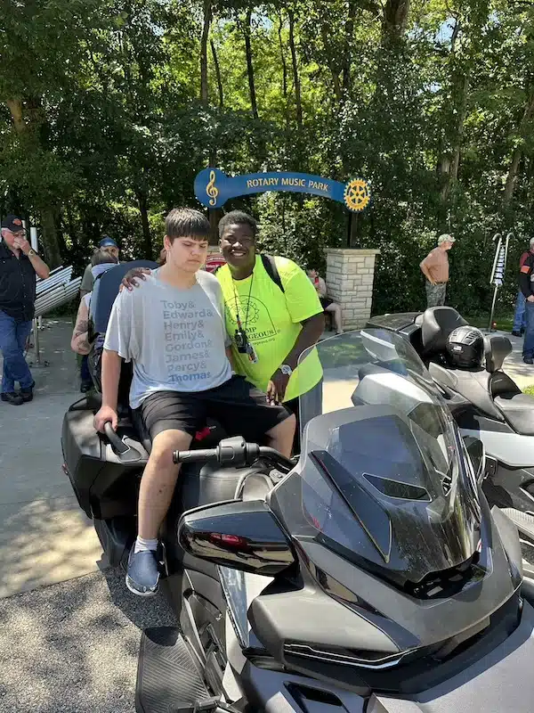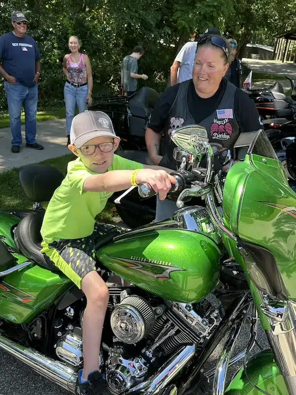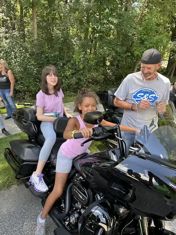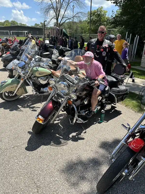 Campers were hopping with excitement as they heard the motorcycles pass through the gates of Camp Courageous.  Most could not wait to sit on one of these shiny bikes.  The dozens of cyclists were wonderful to the campers, giving them the thrill of sitting and exploring their bikes…it made the day for many campers and many bikers.