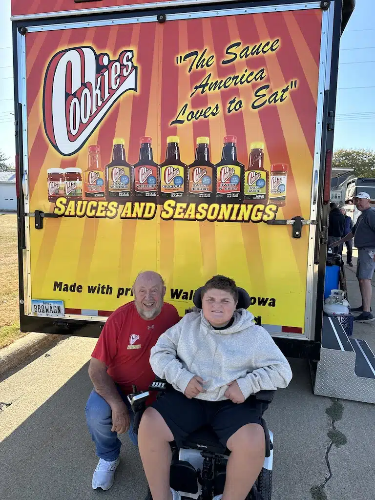 Once again, a huge thank you to Duane “Speed” Herrig, also known as “The Sauceman,” for bringing his Cookies BBQ Wagon back to Monticello, IA to benefit Camp Courageous at the Monticello Fareway. Speed is a founding member of the Iowa Barbecue Society and Owner of Cookies Food Products in Wall Lake, Iowa. Speed started in the barbecue sauce business in the 1970’s and is a legend across the Midwest, making Camp Courageous grateful that he chose them to be part of this benefit. Speed has been a dear friend since the Camp Courageous and the Cookies booths were neighbors at the Petroleum Marketers and Convenience Stores of Iowa Convention for decades in Des Moines, going back to the early 80s. Thank you to the Monticello Fareway, for giving Camp & Cookies the opportunity to sell from their parking lot. With Speed (L) is Cooper Yonkovic, who has been a camper at Camp Courageous during Muscular Dystrophy Week.