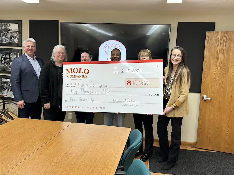 Camp Courageous was thrilled to have our dear friends from the Molo Companies visit Camp Courageous for a check presentation and tour of the facilities.  Molo had a Fuel Round-Up where the company and the customers rounded their purchases up for Camp Courageous…a huge success!  (L-R)  Camp Courageous Board Member and COO/VP of Molo Companies, Glenn Hasken; Cathy Morrison from the Hiawatha Store; Melissa Edwards, Dubuque; Marcus Rush, Dubuque; Jacque Hager, Retail Operations Manager, Dubuque; and Camille Willett, Molo’s Marketing person.  Super group of good and caring individuals that are very involved in giving back to the area.
