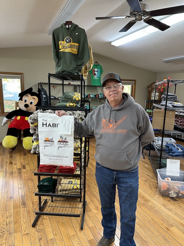 Camp Courageous is grateful to the Delaware County Peasants Forever for their donation of several acres of specialized seed for the Helen & Francis Pitlik Observatory area. Here Thayne Benz of the Delaware County Peasants Forever presents one of many bags of seed for this project.  Jeff Pitlik, volunteer project specialist contacted Mike Schmitz of Greeley, IA, who is President of the Iowa State Council of Pheasants Forever and is on the Delaware County Board, to see if they would consider helping with this nature preserve area.  This group has been involved with Camp Courageous for many years, including development of the prairie located by Lake Todd.
