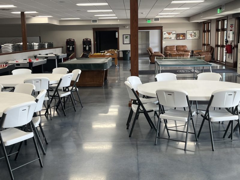 The Camp Courageous Durgin Pavilion is a two-level structure overlooking Lake Todd. This building features an upper level with a open spacious area that is used for all types of camper activities, such as dances and parties. The lower level features a two-lane bowling alley, arcade games, and a walk-out to a large patio area. This building is available for rental by the general public when not in use by camper programs.