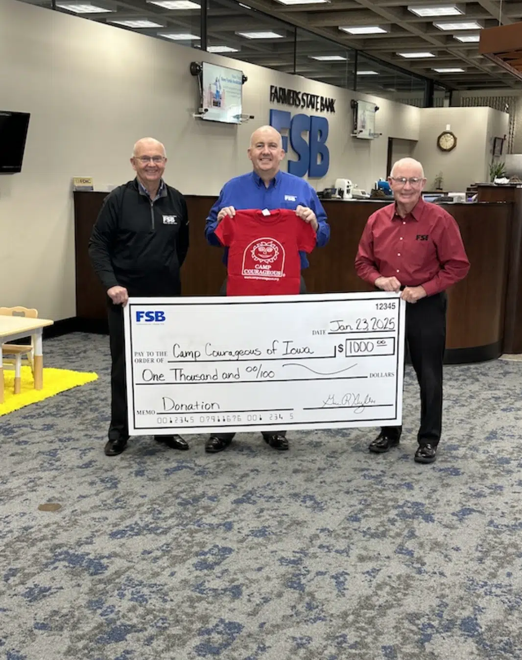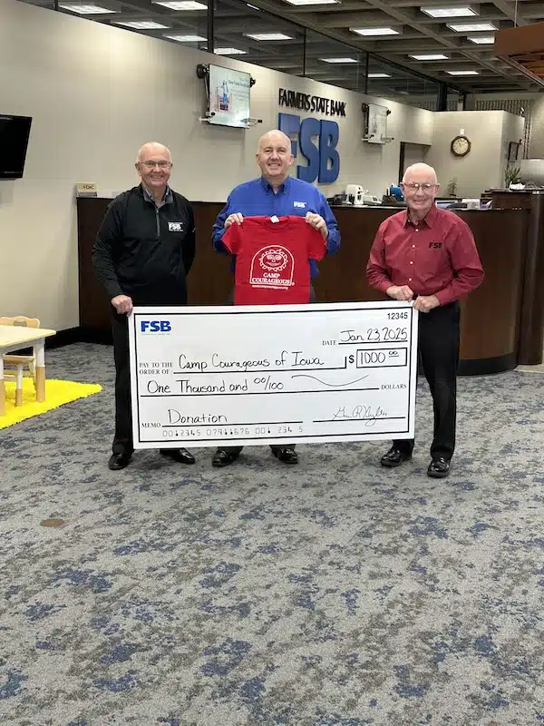 Camp Courageous is grateful to Farmers State Bank, for their decades of support, and in particular, their support of the ‘Camp Courageous Camper T-Shirt Program’. Every camper, who attends Camp Courageous, receives a free t-shirt…and we are talking thousands. The t-shirt is a keepsake that is treasured by each camper. Presenting the check are three wonderful individuals, all extremely active in the community and giving back. (L-R) Gene Neighbor, Chief Wealth Officer of the Wealth Management Division of FSB; Steve Neighbor, President & CEO of FSB; and Kent Neighbor, Chair of the Board of FSB. Being locally owned and family-owned is at the core of FSB’s foundation. FSB supports many local Iowa organizations by volunteering thousands of hours and donating thousands of dollars annually.