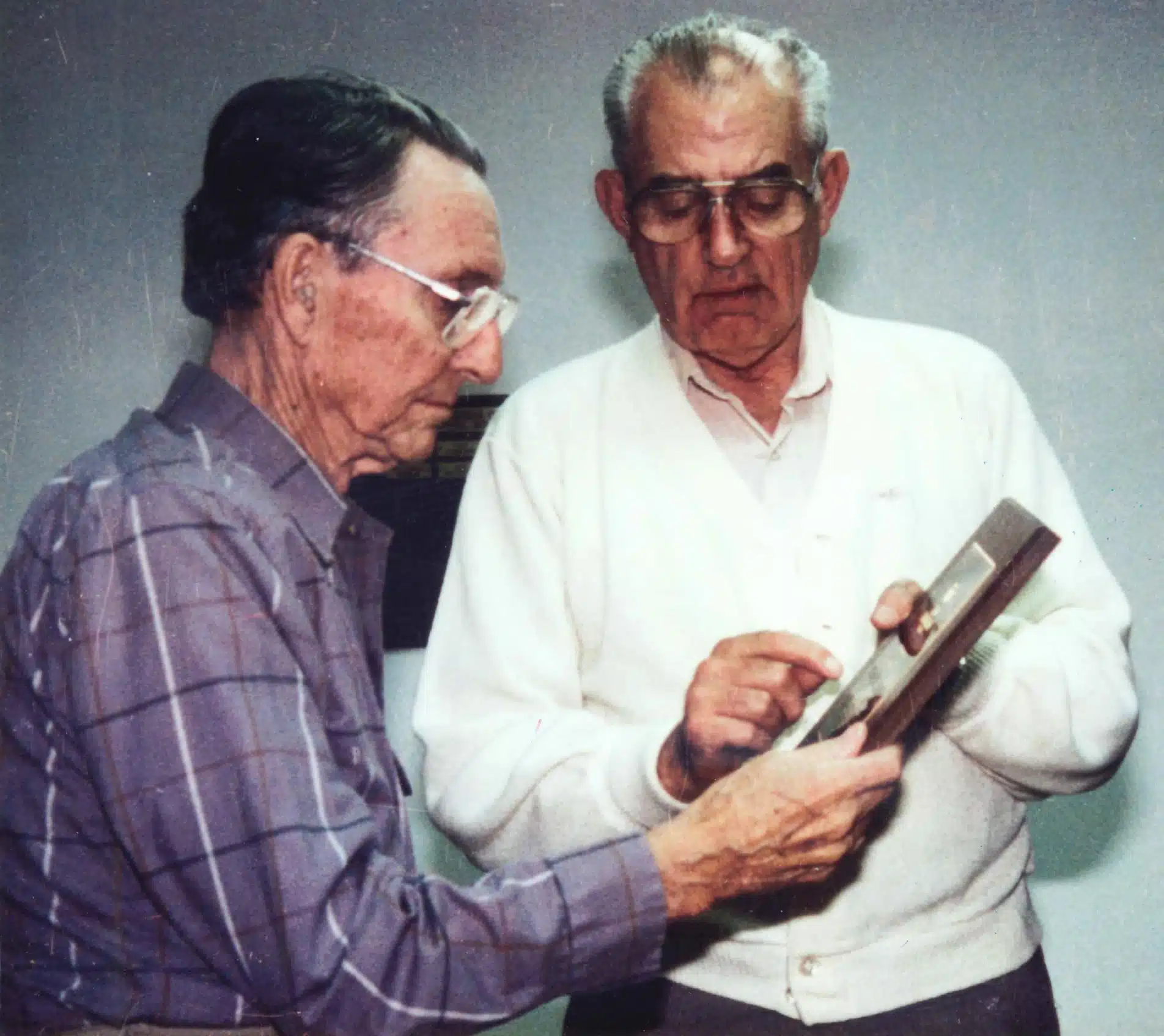 Board President, at the time, (R) Dr. Lyman Perkins, presents (L) Wilfred (Shelly) Shellenbarger with the Camp’s Honorary Board Award.