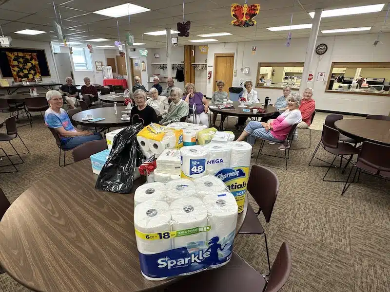 A big thank you to Jean Gritman for inviting Camp Courageous to give a program to the First Presbyterian Church in Marion. This wonderful group has been involved with camp for many years. Great questions and a lot of good reminiscing, as they have watched the Camp grow over the years. In front of the group is a pictured all the paper products they collected for Camp.