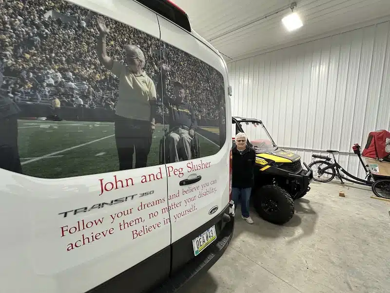 Camp Courageous Board Member, Peg Slusher, stands between a van she joined with others to provide Camp Courageous and the “Hawkeye” that Peg and her late husband, John, provided the Camp Courageous Medical Team to handle emergencies…it is a 4-wheel All-Terrain Ranger Ambulance. John & Peg have been involved with Camp for decades. The picture on the back of the van is of John & Peg being recognized at a University of Iowa Football Game for their exceptional support and reads “Follow your dreams and believe you can achieve them, no matter your disability. Believe in yourself.” Peg is a regular volunteer at Camp.