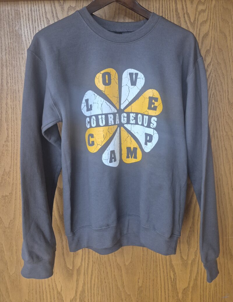 Proudly wear this charcoal sweatshirt to show off your support for Camp Courageous.ย โLove Camp Courageousโ is printed in yellow and white on a Gildan brand sweatshirt made of 50% cotton and 50% polyester.