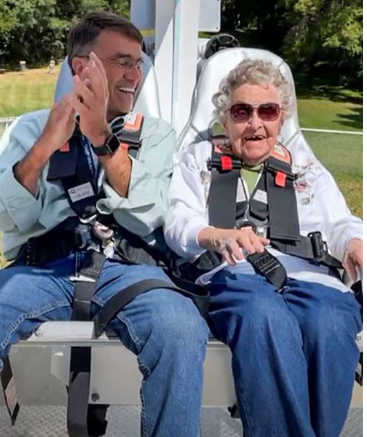 Vera Gienapp was part of a group visiting from The Meadows and, at 100 years old, became Camp’s oldest person to ride the new 700 foot zipline, four years ago.  Vera rode the previous zipline that was located in the woods, but commented that she enjoyed the new zipline even more.  It was wonderful to have her and the entire group from The Meadows, enjoy one of Camp’s newest adventure