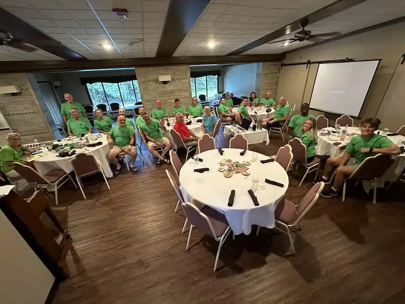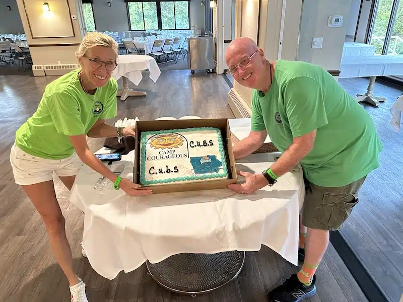 The Chicago Urban Bicycle Society (C.U.B.S.) once again came through in a huge way with their annual dinner/auction during RAGBRAI (Register’s Annual Great Bicycle Ride Across Iowa) to benefit Camp Courageous. At Thursday’s overnight in Ottumwa, they had their dinner/auction at the Ottumwa Golf Course for Camp. Long time leader Brad Prendergast and C.U.B.S. Board Member Dana Nelson presented a cake in honor of the two groups. In the middle of the group picture, in red and green shirts is Camp Board Member Jim Foels and his wife, Elsie. Each year the Foels offer an Iowa Farm Experience to the high bidder…which has been a huge hit! This relationship with the C.U.B.S. started 19-years ago and has grown in many positive ways over the years. Absolutely super group!