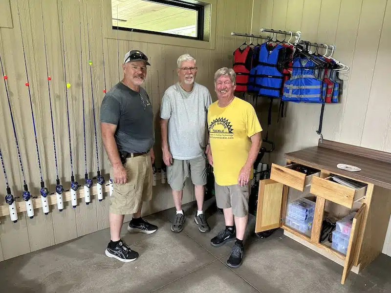 (L-R) Mark Brecht, Tracy Hayward, and Dave Nichols spent a day equipping the new The John & Peg Slusher Tacklebox facilities with the latest and greatest in fishing equipment cupboards, life jackets and so much more.