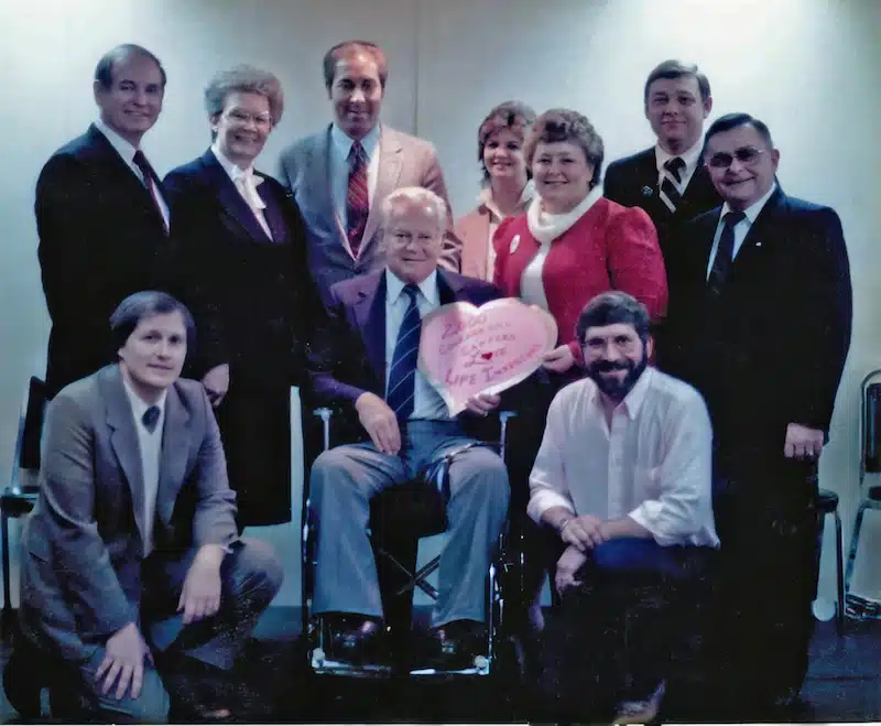Pictured here, in the back row (L-R) are legendary Life Investors employees: former governor, and then CEO of Life Investors, Bob Ray, Marie Swope, Wilburn Hollis, Chery Peyton, Pat Ryan, Art Christoffersen and Charlie Stortz. In the front row is: Pat Baird, Theron ‘Tommy’ Thomsen, and Jim Kuchenbacher.