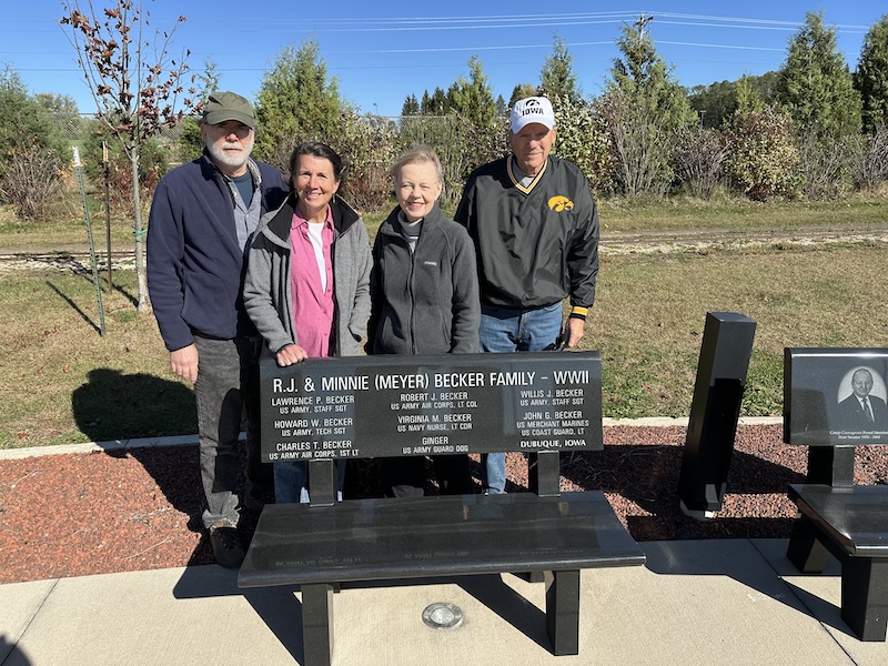 It was a special treat for me to have some of my dear cousins visit Camp Courageous.  I have been humbled, and heart warmed to have had 100% of my eleven Becker uncles and aunts, along with most my cousins, who are spread across the United States, support Camp Courageous over my 45+ year tenure.  Here are cousins Jim Becker, of Minneapolis, MN; Paula Becker Day, of Solon, IA; Amy Becker, of Iowa City, IA; and Tom Becker, of Riverside, CA…(their brother, Joe Becker, of Dubuque, IA; had to leave early and missed the photo). They are my Uncle Willie & Aunt Grace Becker’s Family, with their roots in Dubuque, IA.  While touring we stopped at the Mainliner Memorial Park, where a bench honors the Becker Family who served in the military during WWII.    Seven out of the eleven Becker children went to War, along with the family’s German Shepard, ‘Ginger’.  In April of 1941, my dad,  Howard, became the first of the 7 Becker siblings to enter the US Military and serve in World War II.  He had landed on the beaches of Normandy, 10-hours after the invasion began, June 6, 1944, 81-years ago.  The cousins bought several bunk beds for the newly remodeled South Cabin Project…I am deeply touched…